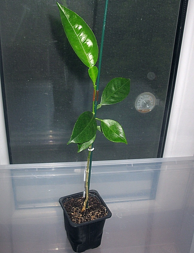 И так, прошёл почти месяц с момента приобретения прививки. За это время саженец был пересажен из объёма в 0,8л. в тару 0,29л., с заменой грунта на кокос+перлит (2/1). Так же снята обвязка, и поставлена опора для выравнивания тоненького стволика (тоньше спички). Не смотря на это, тепло и прожектор, в качестве досветки свою работу делают, и он всё же выдал парочку вполне сочных листов, без всяческих признаков какого либо недостатка микроэлементов. Стало быть корневая заработала и можно ожидать в начале сезона нормальную волну роста. Сейчас выглядит так: