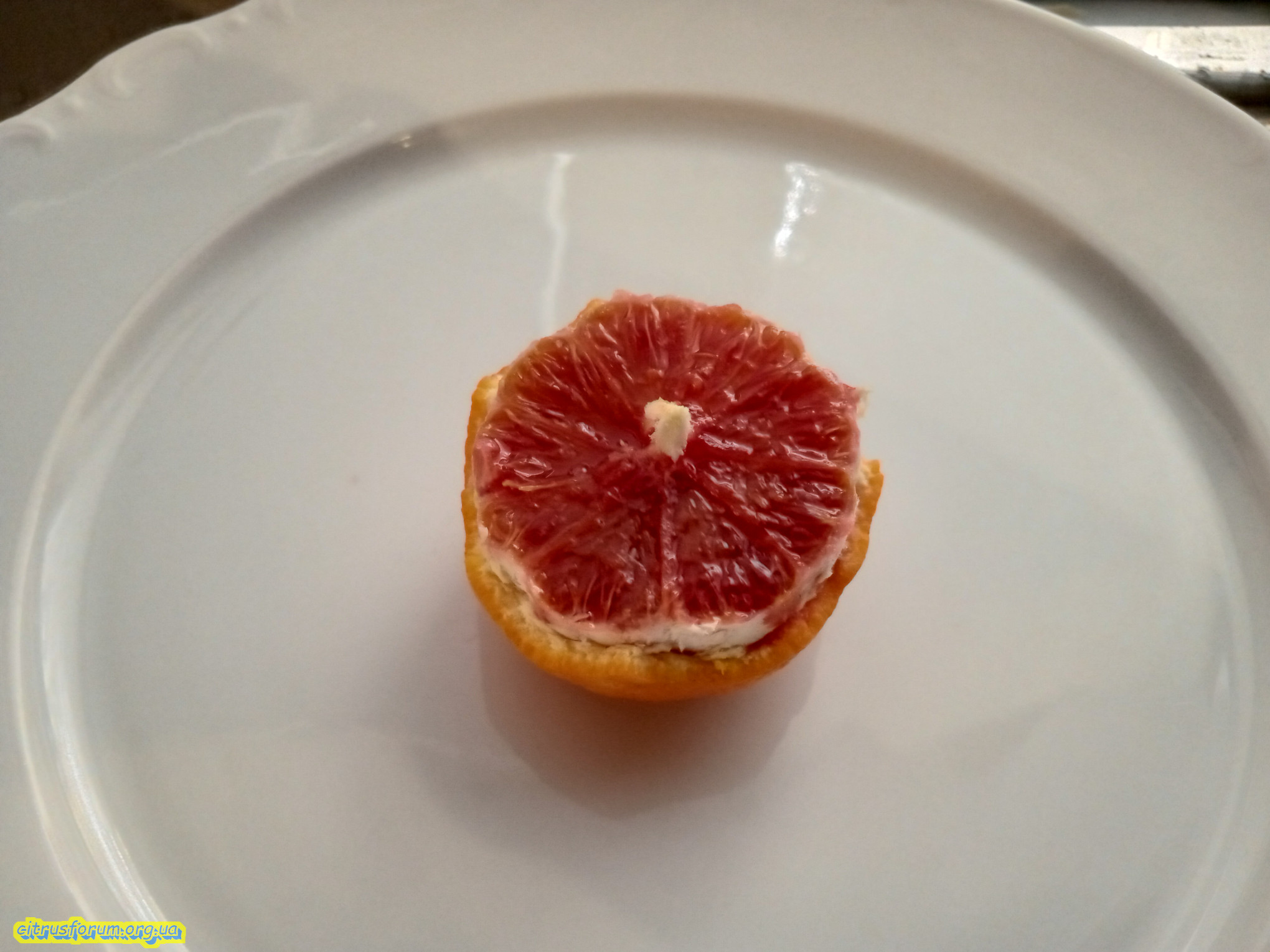 клементина ‘Comune 2x’ x апельсин 'Тarocco tetraploide'. Плоды сочные (49%), без семян, легко очищенные, округлые или слегка сплющенные, кожура гладкая. Средний вес 180-210г.