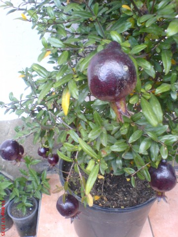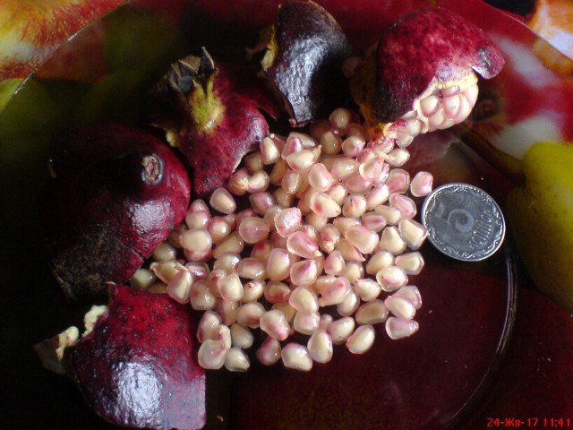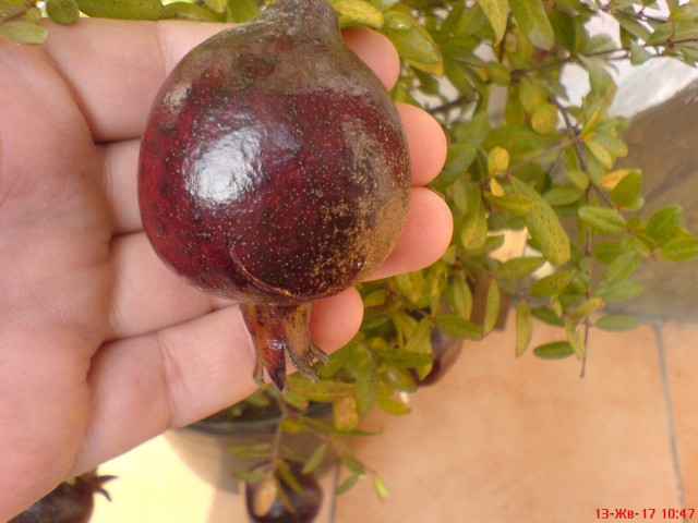 Перше плодоношення гранату "8 шар". Що цікаво, - колір плодів змінювався з червоного на чорний, потім на чорному знову проступало червоне. Смак - як у звичайного гранату.