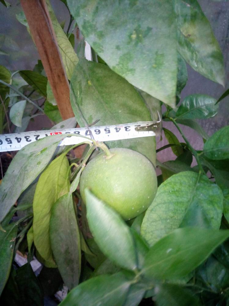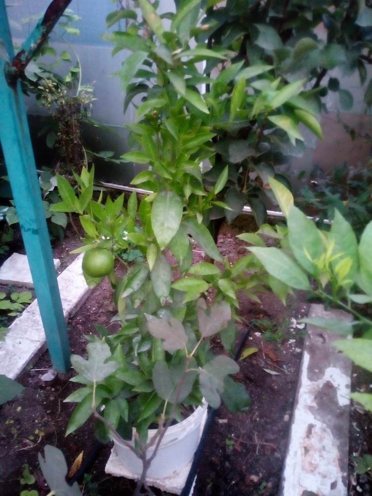 clementino x arancio OTA38 пока небольшого размера и зеленый - явно зимний срок созревания. Цветение было редкое, рост при наличии плодов умеренный. Растет компактной пирамидальной формой - в обрезке не нуждается, плоды держатся без подвязки