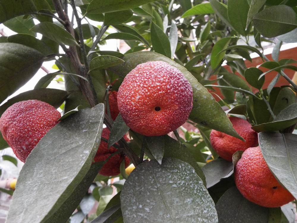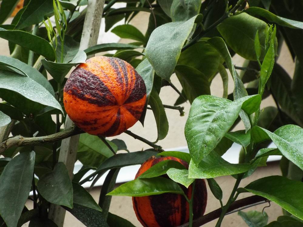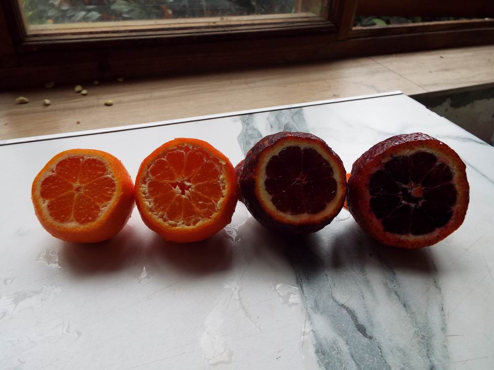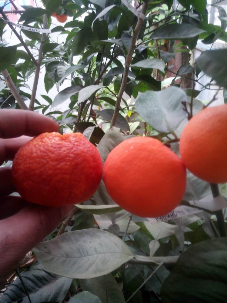 Тангор Амоа8 vs клементин Рубино. Было подозрение что это один сорт под разными названиями. Поэтому в крону дерева-сада были привиты оба сорта для получения плодов в одинаковых условиях. Кожура Амоа8 неровная, плотная, с красными вкраплениями на темно-оранжевом фоне, возможно может стать еще краснее. Активное покраснение произошло после похолодания в начале декабря, когда получился значительный суточный перепад температуры от +5 до +25. Кожура Рубино гладкая, тонкая, ярко оранжевая с красноватым оттенком. На окраску плодов Рубино значительно влияет подвой! На лимонном подвое цвет Рубино скорее желтый, чем оранжевый. Плодов Амоа8 на другом подвое нет, поэтому о влиянии подвоя на цвет его кожуры нет данных. Есть предположение, что итальянский Амоа8 на макрофилле и чешский Трабут на цитрумелло это один сорт, который растет в разных условиях. Для определения этого Трабут был привит в крону Амоа8 - результаты ожидаются на следующий год.