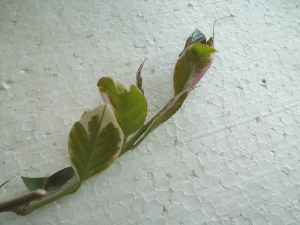 Розовый прирост и вариегатность листьев на солнце - лимон Альба (Сitrus limon 'variegata alba')
