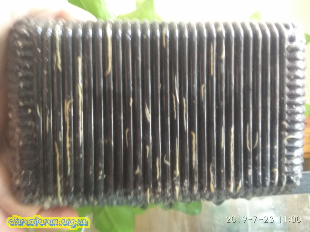После 1,5 месяца простоя в результатах, наконец - то у меня укоренился первый черенок апельсина (Sanguinello Moscato Nucellare). Срок укоренения около 2,5 месяцев в торфтаблетке в тепличке на подоконнике. Выход корешка из торфтаблетки я прозевал, так как последнее время заглядывал в тепличку раз в 5 дней. За это время он успел прорасти в соседнюю торфтаблетку с черенком климентина Рубино и вылезти из нее с противоположной стороны. Поэтому вчера я был совершенно уверен, что укоренился черенок климентина Рубино (притом у него был небольшой прирост) и начал сначала извлекать его из здвоеных торфтаблеток. Только когда я полностью удалил защитную сеточку на торфтаблетке я увидел свою ошибку, что это корешок из другого черенка. В последствии, так как целосность торфтаблетки с черенком климентина уже была нарушена я всетаки решил вскрыть ее до конца, чтобы извлечь черенок и поставить его на повторное укоренение. Результат в виде трех небольших корешков, которые еще не показались снаружи приятно удивил. Таким образом вместо одного укорененного черенка оказалось сразу два (апельсин и климентин).