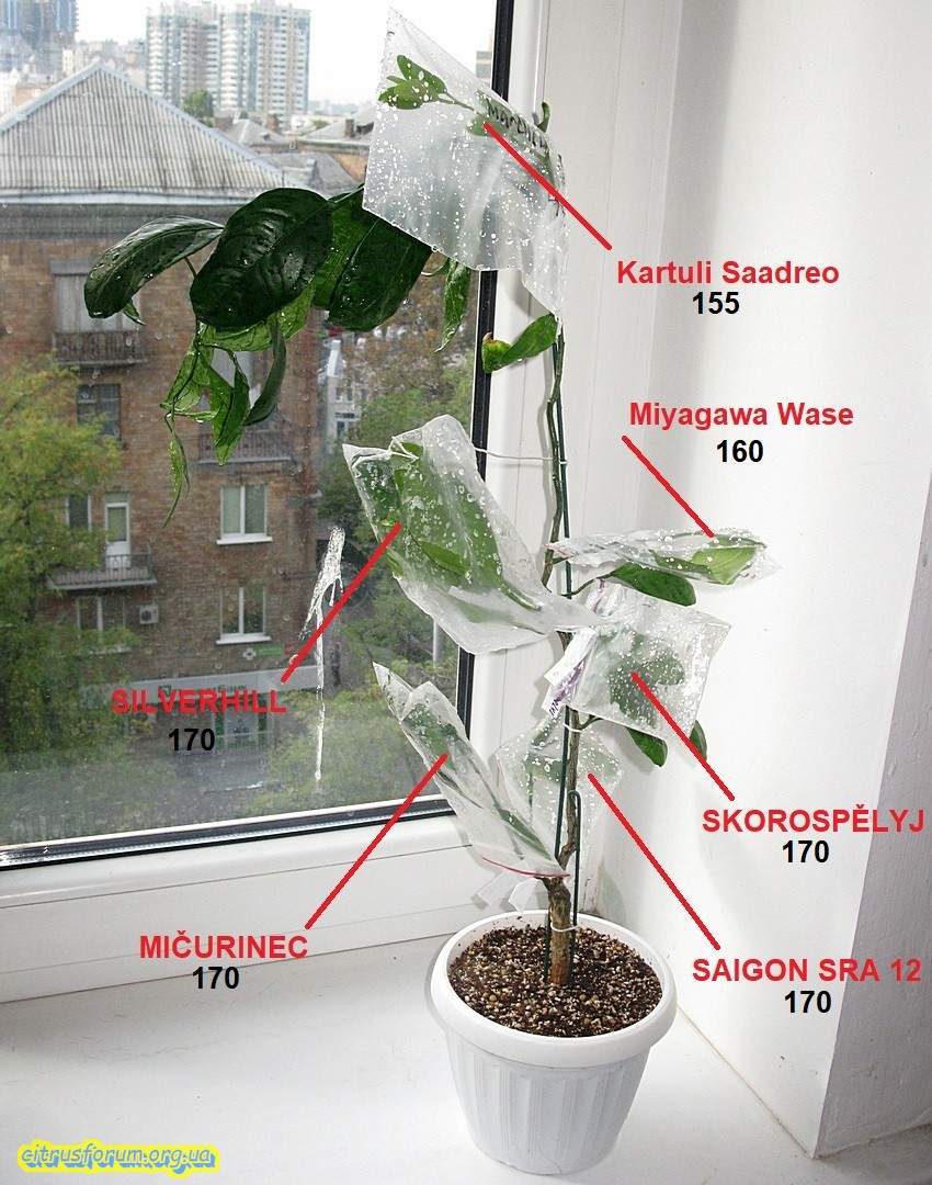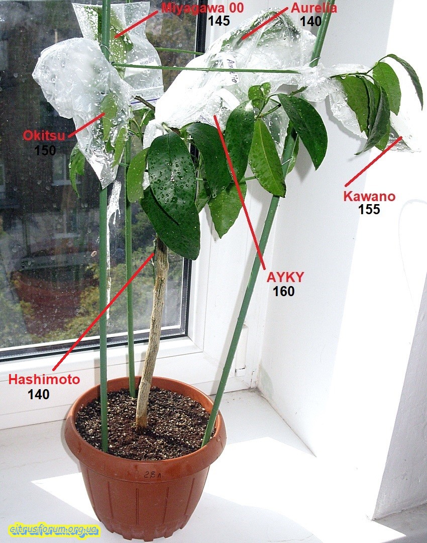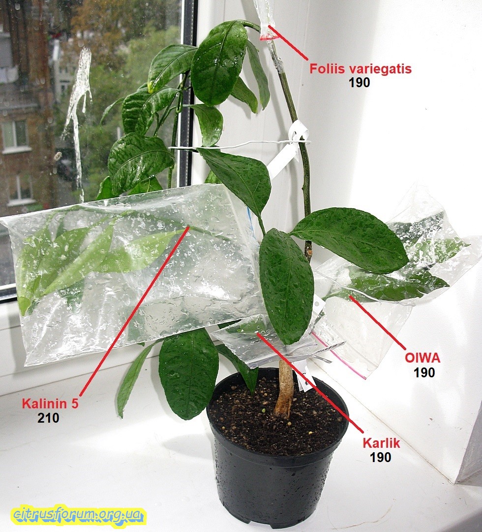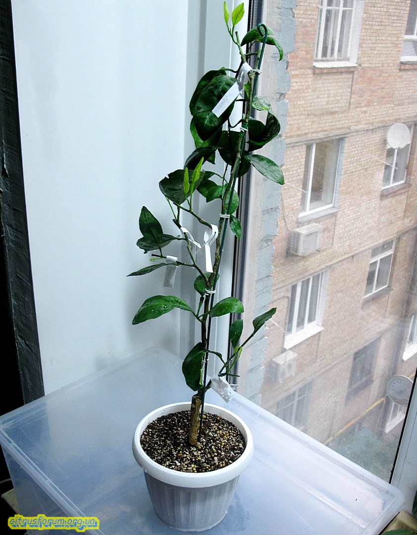 Продолжаю освещать, начатую вчера тематику. Сегодня показывая следующий цитрус, принимавший участие в эксперименте, описанном в ранее написанной статье. На сей раз показан цитрус, в конце стадии роста корней, и приближающейся фазе роста кроны, приблизительно за неделю до оной. Было привито одномоментно 4 прививки, две из них в крону, остальные на проросшие ранее побеги подвоя. Прижилась только половина прививок, и что интересно, только те, которые прививались на побеги подвоя. В кроне не прижилось ничего. Таким образом эта стадия развития цитрусов оказалась наименее подходящей для выполнения прививок. На первом фото цитрус, который брался с названием сорта Kpara, на который и прививались прививки. Как сказывал хозяин данного саженца, некий новый гибрид из Батумского бот. сада, между каким то мандарином из группы уншиу и каламондином. Вроде как были претензии на ремонтантность. Пока об этом сказать нечего, ибо даже цветения пока не было. Ну а в итоге имеем цитрус с тремя сортами, прижившимися именно на побеги подвоя. Другими словами культурная часть бывшего саженца и две прививки сентябрьские. На последующих фото показаны прижившиеся две прививки из четырёх прививаемых. На этих фото вся необходимая информация по датам и источнике черенков. Одна из прививок дала прирост, который уже вызрел.