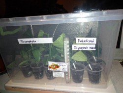 Вот такую теплицу мне муж соорудил .Деревянный короб , внутри на стенах пенопласт ,по верху пенопласта изолонг,подогрев внизу сделал типа теплого пола(нихромовую проволку заливал).Пока проводили испытания ставили в теплицу что не жалко(поставила на укоренение верхушки сеянцев лимона ,оставшиеся после прививок ).Температуру держит от 23 гр до 26 гр,стоит регулятор температуры (самодельный).Подсветка стоит сверху светодиодная над теплицей ,свет включается одновременно на подоконнике и над теплицей,стоит таймер включения с 5 утра до 7 и с 17 .00 и до 21.00.