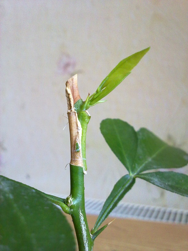 Есть у меня сделанная еще осенью прививка Лиметты Дольче Романа на цитрумелло, Вроде осенью хорошо прижилась, а затем практически за 2 дня усохла за исключением одной почки, ну все думаю прививке конец, решил, как понадобится повой использую, а она через пол года решила пойти в рост. До сих пор не пойму за счет чего она питается но явно хочет жить