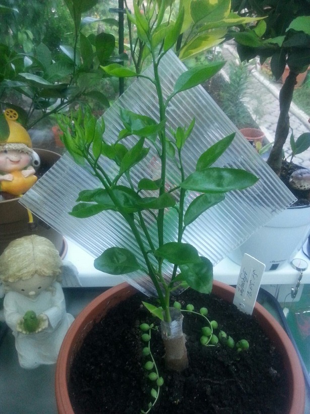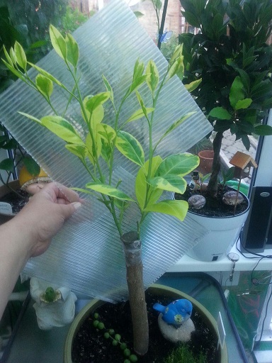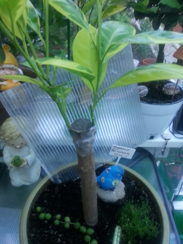 Вот фото двух прививок, дело было так: получила я супер-пупер-мега классный черенок, ну конечно необходимо было найти такой же подвой, ради этого снесла башку не очень вкусному грейпфруту и померанцу, позже случился Шок, и просто печаль - беда, прививки не удались, позже выяснилось причина была в качестве черенка, на вид черенок был хорошим. Ну, а два хороших пня теперь гуляло, на один я привила вариегатный мандарин, (он растет на памело, и вроде ничего, но как то чуть слабоват) на другой привила Трабут.