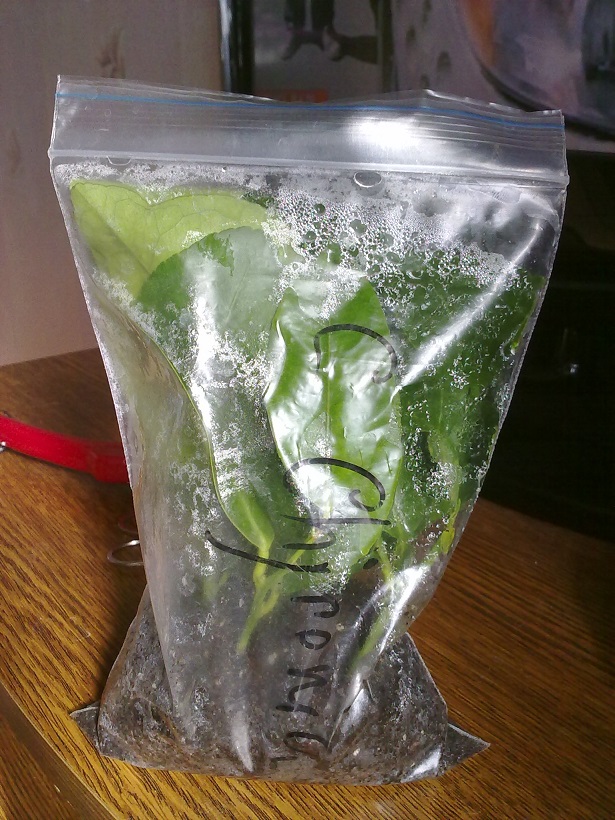 Понадобится зип-пакет подходящего размера, на дно насыпаем грунт, я использовал покупной грунт смешанный с песком в соотношении 50/50, утрамбовываем его и немного поливаем. Срезы черенков припудрил гетероауксином и вставил в грунт, закрыл пакет и забыл недели на 3. Хотя такому хорошему нарастанию корневой, возможно поспособствовал и нижний подогрев, пакет стоял на подоконнике, под которым находится батарея.