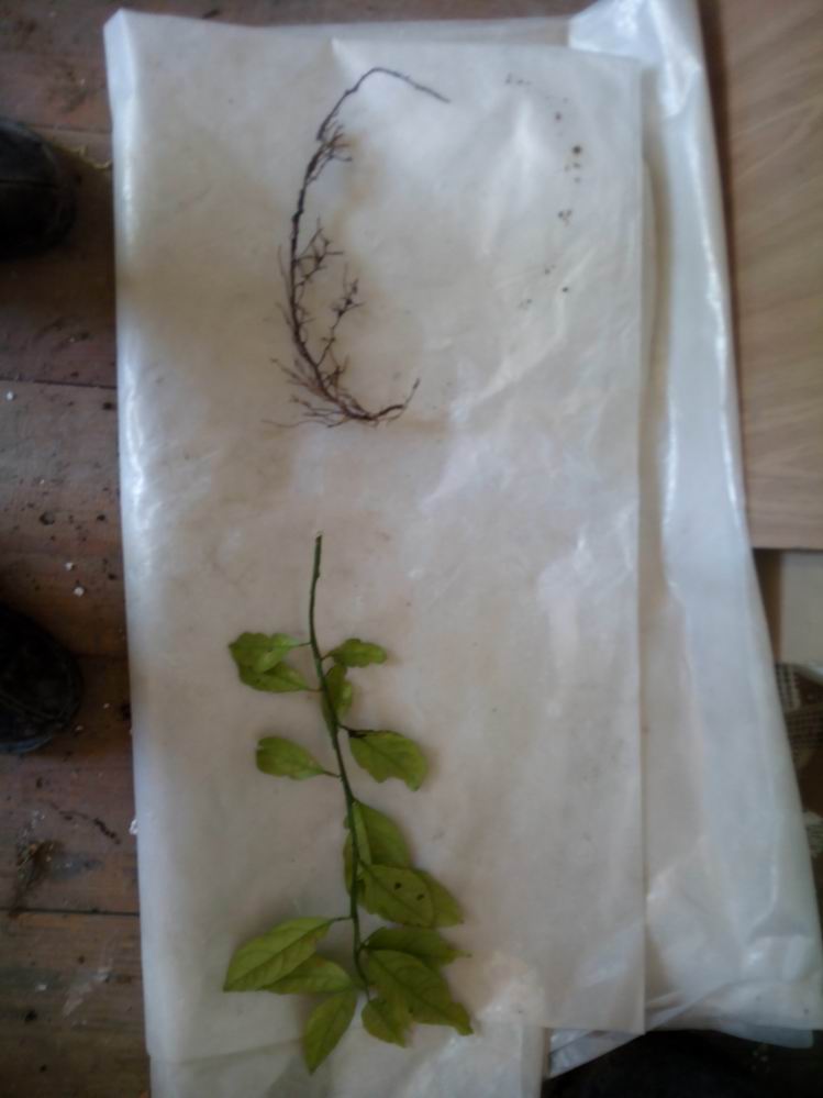 При выкапывании цитруса из грунта оказалось, что он пророс корнями через мешок в грунт и кусок корня оторвался.