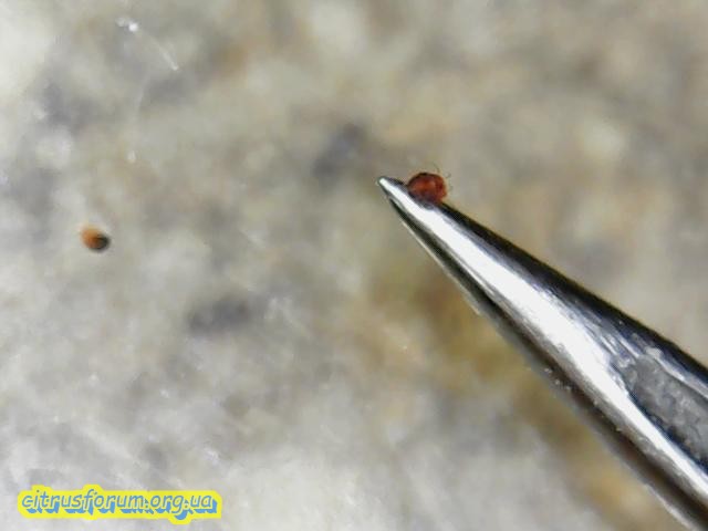 Так получилось, что с тангором ко мне попал "чешкий" красный клещ, он довольно крупный, а также из-за того что окрашеный еще более заметный. С начала 2018г. я стал замечать на тангоре мелкие "песчинки", не придал особого значения, раньше таких цветных клещей не видел, да и как оказалось позже, тангоры ему на вкус не особо нравятся, пальмы он вообще не ест, но лайму он здоровье сильно попортил.