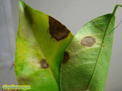 СимптомиЛистя. Початкові ураження листя з’являються на молодій тканині у вигляді невеликих коричневих або чорних плям, які утворюють яскраві жовті ореоли (круги). Поразки (ураження) поширюються на неправильні або круглі некротичні ділянки, які можуть охоплювати великі частини листя, особливо на дуже чутливих сортах, таких як «Minneola». Утворюється грибковий токсин, який може викликати некроз і хлороз уздовж вен, що відходять від уражень . Поразки плоскі і помітні з обох боків на листі. Старіші ураження мають крихку паперову структуру в середині ураження.