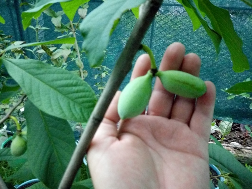 Плодики разных сортов азимины на 13 июня 2018 г. Деревца растут в контейнерах от 15 до 25 л, под притеняющей сеткой (это те, которые я показывал на видео об опылении азимины).