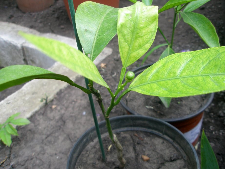Вот с этим проще ... Уншиу. Долго не рос, а потом выпустил хлорозные листочки и такой же обесцвеченный цветок. Думал, что плод не завяжется, но плодик какой-то полосатенький получился как кавунчик. Наблюдаю за ним дальше.