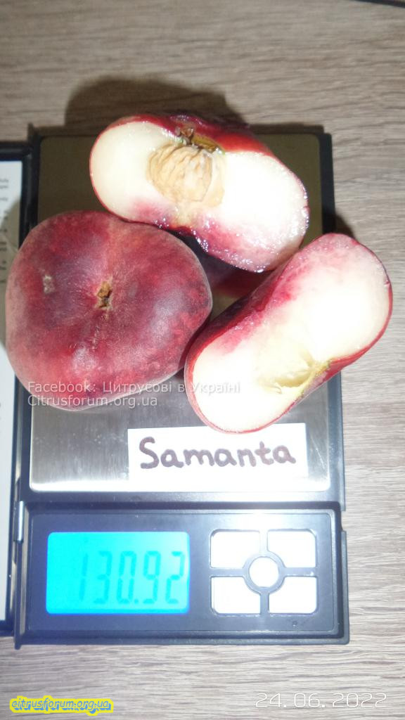Інжирний персик 'Platibelle', солодкий, без кислинки. Мякоть не сильно хрустка, середньо-соковита.