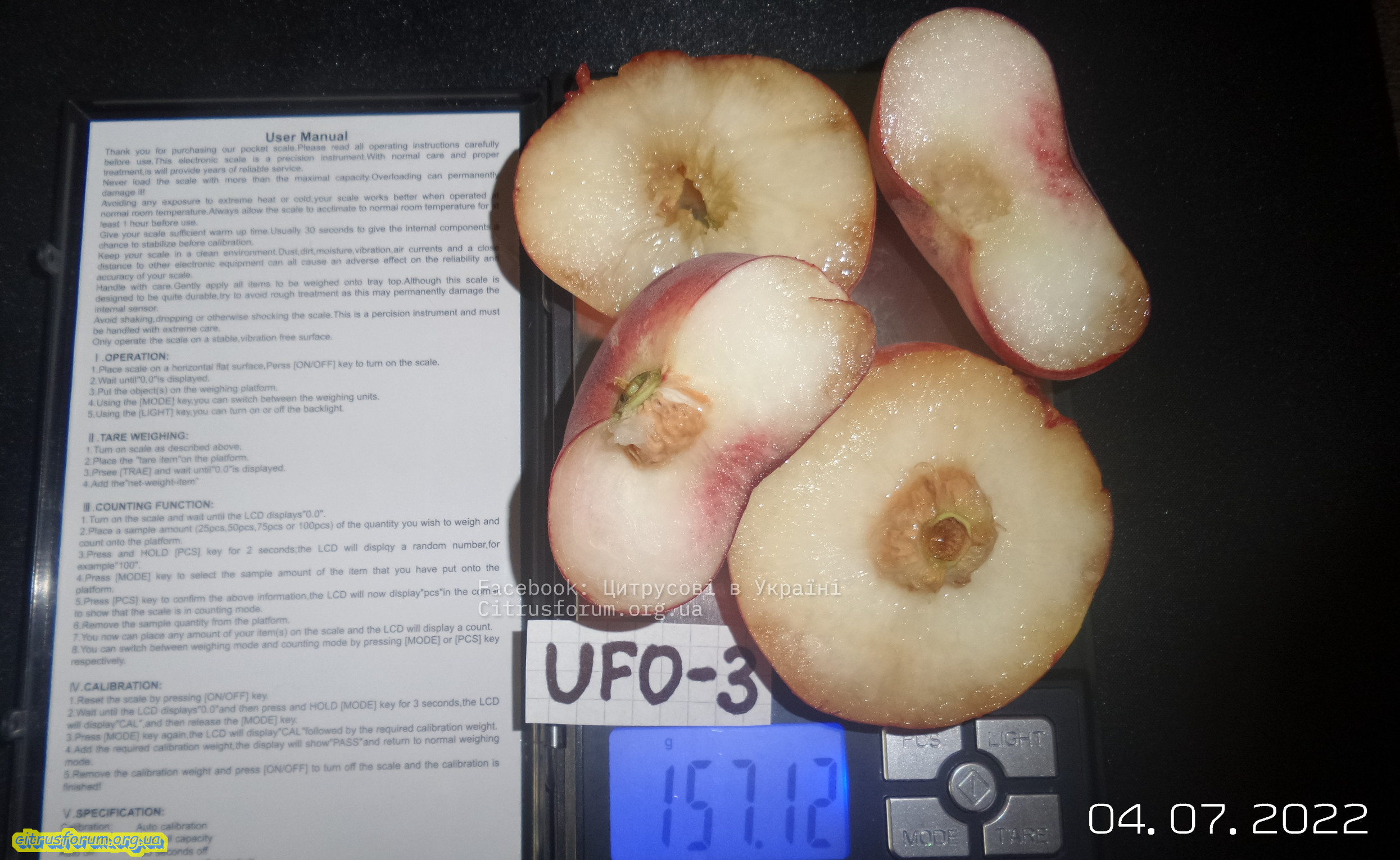 Смак дуже солодкий 14.2%, без кислинки. М'якоть дуже ніжна, м'ягка (не хрустка). Не дуже соковитий. Кісточка маленька.
