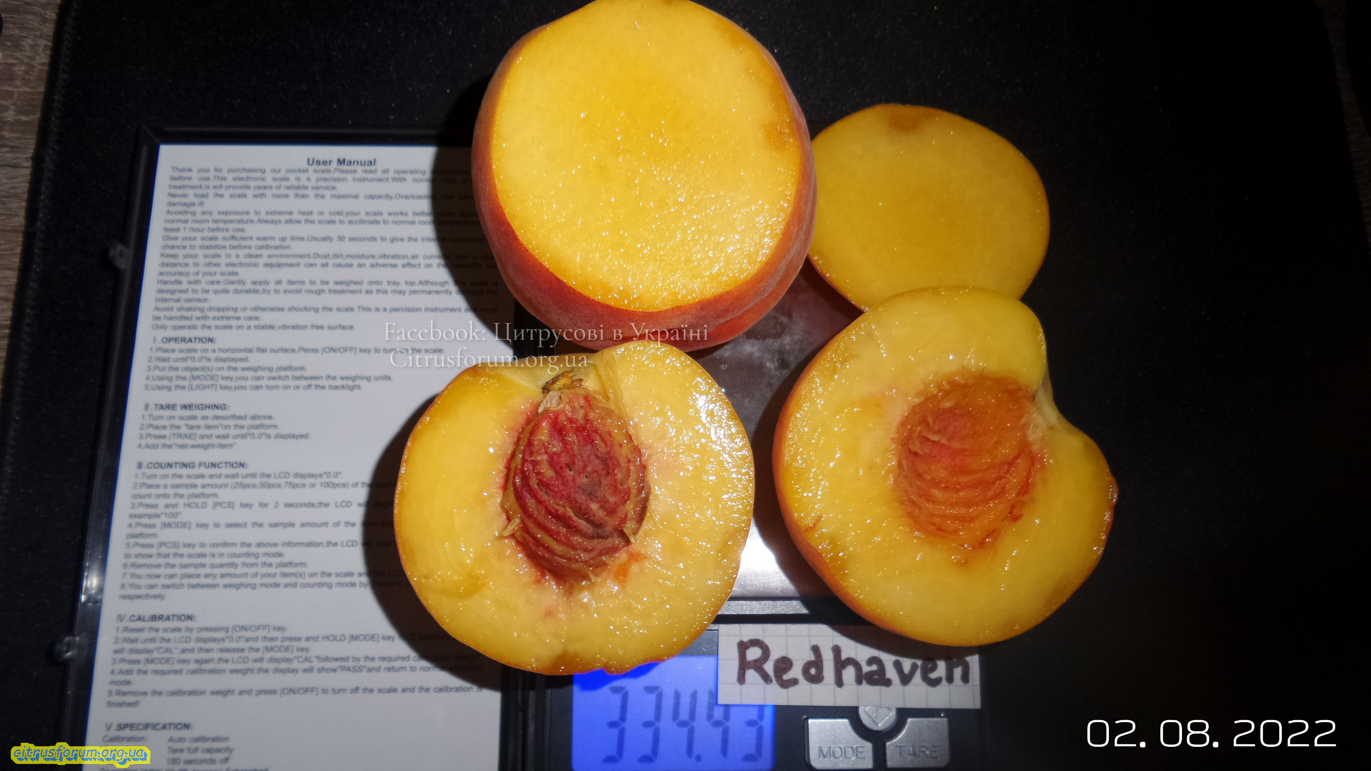 RedHaven (Halehaven x Kalhaven). Смачний, смак збалансований, солодкий з легкою кислинкою. М'якоть мягка, ніжна, соковита.