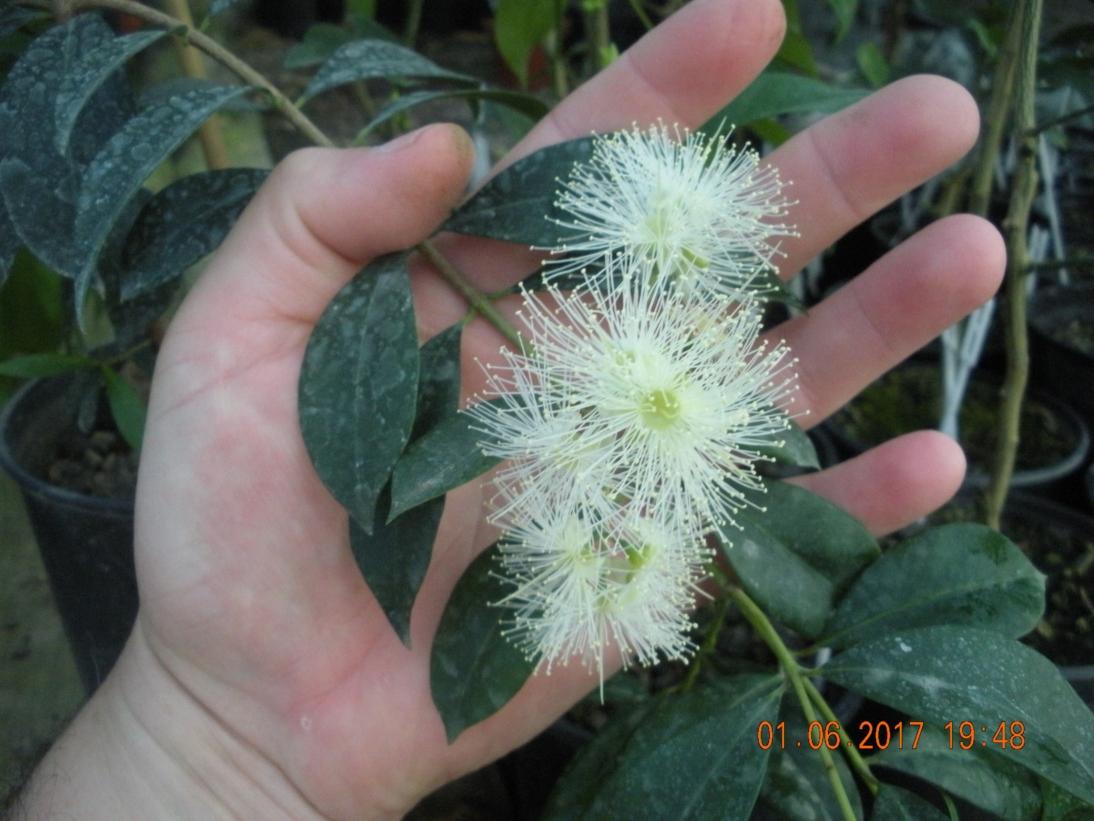 Но кто меня удивил ещё больше, чем маракуйя, так это сизигиум масляный (Syzygium oleosum), или Blue Lilly Pilly. Получил в прошлом году от друга небольшим черенком, а он неплохо вымахал и зацвёл. Очень надеюсь попробовать плоды. Я думал, надо будет ждать несколько лет.