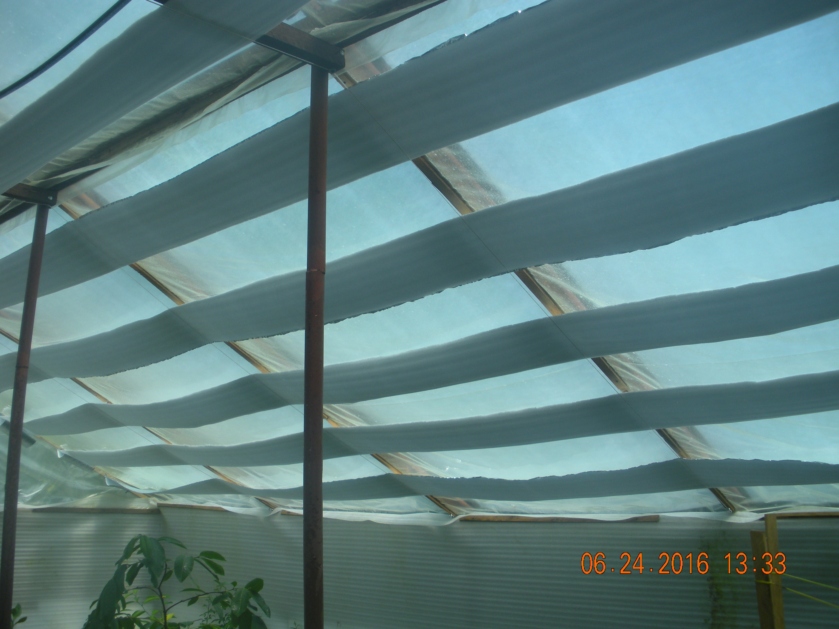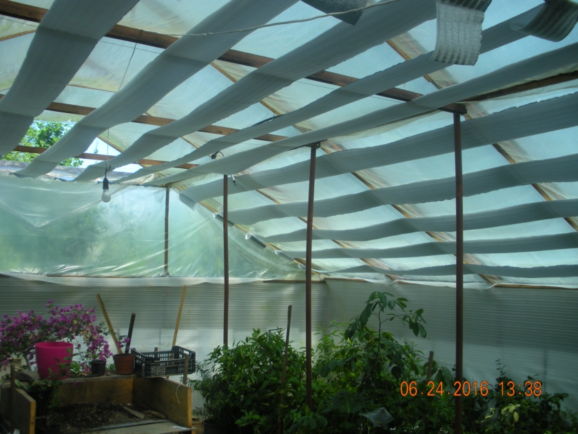 В связи с жарой на днях сделал дополнительное затенение внутри теплицы. Нарезал полосами отражающую фольгу на изолоне и на тросики фольгой вверх при помощи прищепок развесил перпендикулярно движению солнца. Сверху теплицы уже была натянута зелёная затеняющая сетка, но она служит уже сезона три и несколько выгорела. Можно было поверх неё повесить ещё одну, но это было бы уже слишком. А так получились полосы, солнце не светит долго на одну и ту же точку на растении, каждый листик получается на протяжении дня то на более интенсивном освещении, то в тени. Особенно чувствителен молодой прирост. После этого растениям стало заметно лучше. На фото видно то, что было сделано в одной части теплицы. Но лучше, чтобы полосы были более узкими, не 25 см, а где-то по 15-20. В другой части сделал так, только не фотографировал.