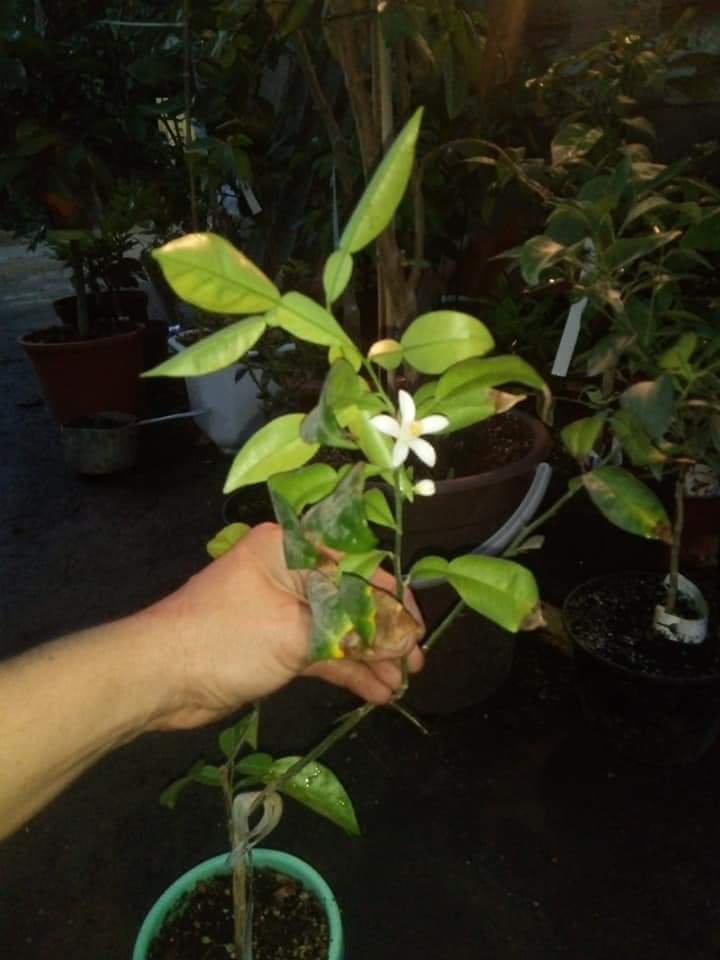 Юзу, первое цветение. Листья не много погорели на солнце. Год сидел без движения,а сейчас начал расти.