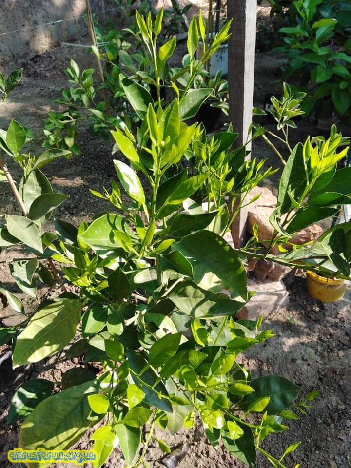 С лева "Волкамерин" (Тинтори), а с права "Tarocco. S. Alfio" (Tинтори) весь в приросте и проявляются бутоны.