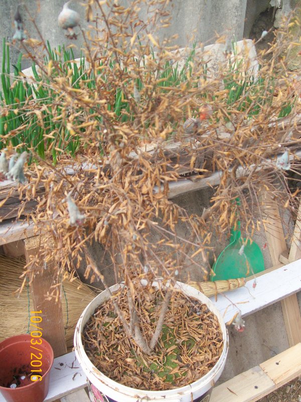 С утра - дождь. Зашел в купол, думал прививки окончу.Но что-то не пошло... Решил чуток порядок навести. Увидел гранат, который еще с осени с высохшими листьями стоит.