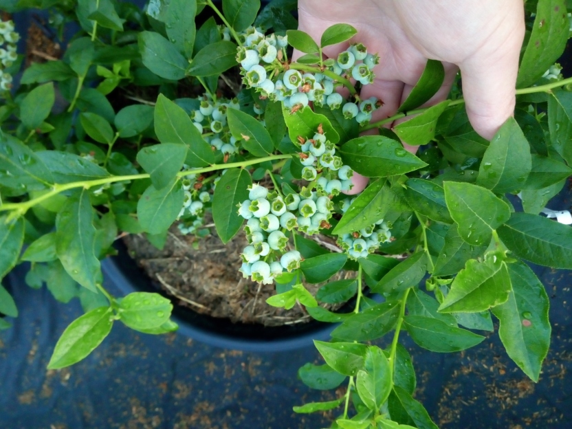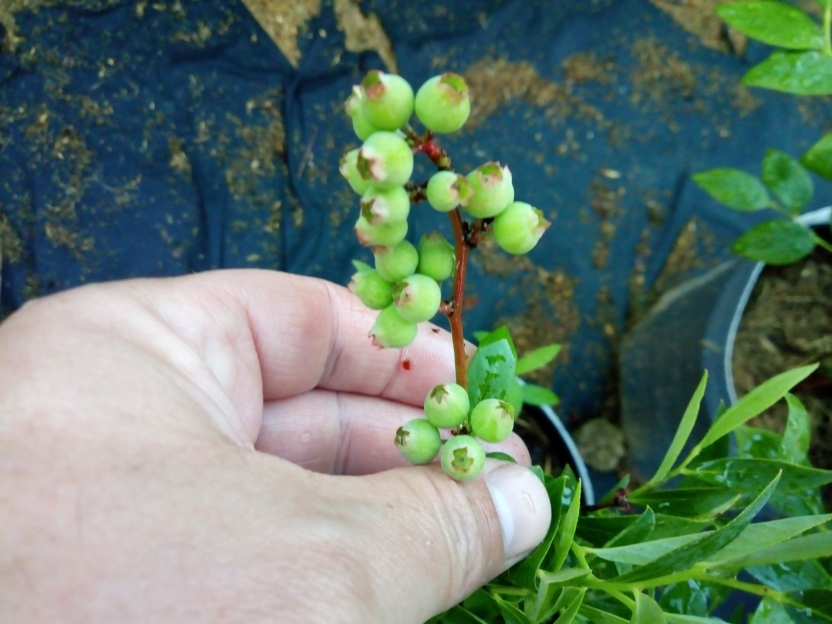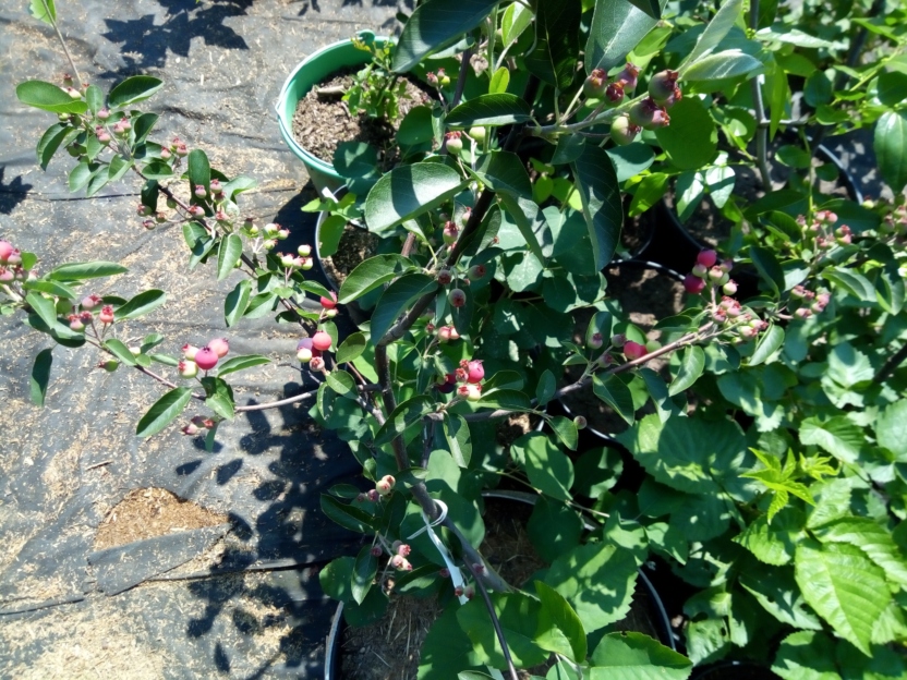 Розовоплодная голубика Pink Lemonade пока что слабовато завязала, да и ягода у неё некрупная. Возможно, в следующем году урожайность повысится.