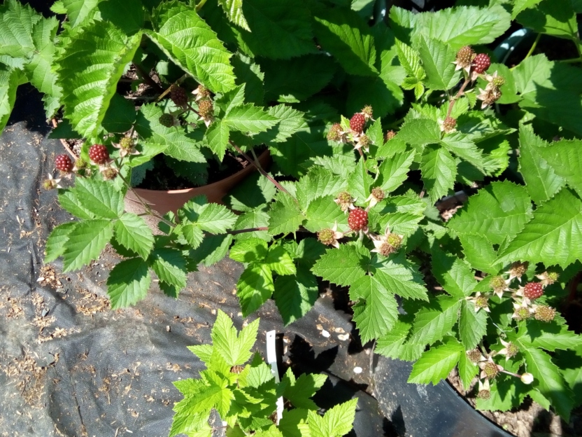 Ежевика Loch Tay начала окрашиваться, хотя размер ягод ещё маленький. Это её первое плодоношение в контейнере на небольшом прошлогоднем побеге.