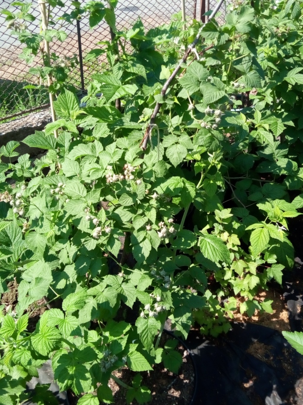 Фиолетовая малина Glen Coe уже давно отцвела и сейчас прошлогодний побег весь в плодах, снизу до верху. Не знаю, хорошо ли видно. Был посажен весной в 7,5 литровый горшок, а на днях перевален в 15 литровый.