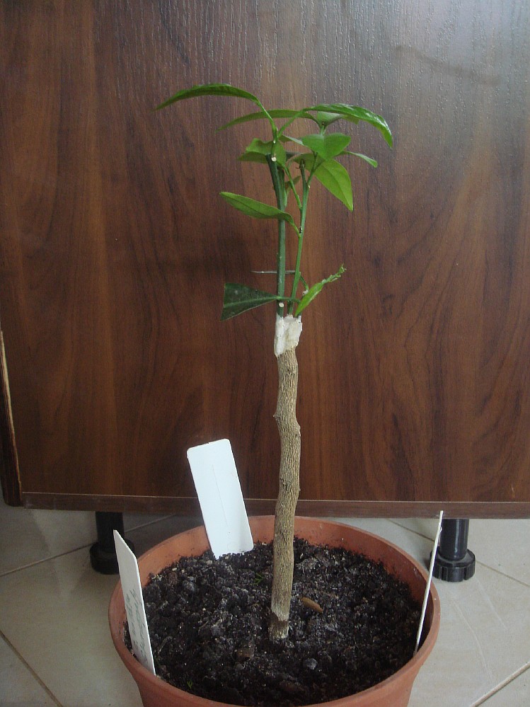А вот это чудо, почему то, осталось без внимания. Как то осенью приобрел два дикаря мандарина в очень запущенном состоянии, но толщина ствола и количество корней уговорили меня их взять. Были использованы для эксперемента. На один посадил мандарины скороспелый, мичуринец и клементин оронулес, на второй - мандарины калинин 5 и ковано. Первый порадовал приростом со всех трех сразу
