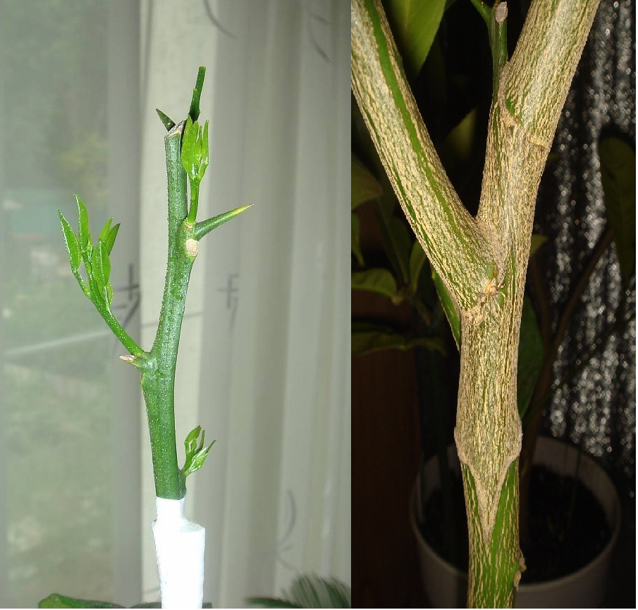 Это дерево меня радует своими темпами роста. На фото одно и то же место с разницей в 15 месяцев. сейчас толщина места прививки - 2 см. Подвой - дичек апельсина и он мне (как подвой) нравиться все больше и больше.