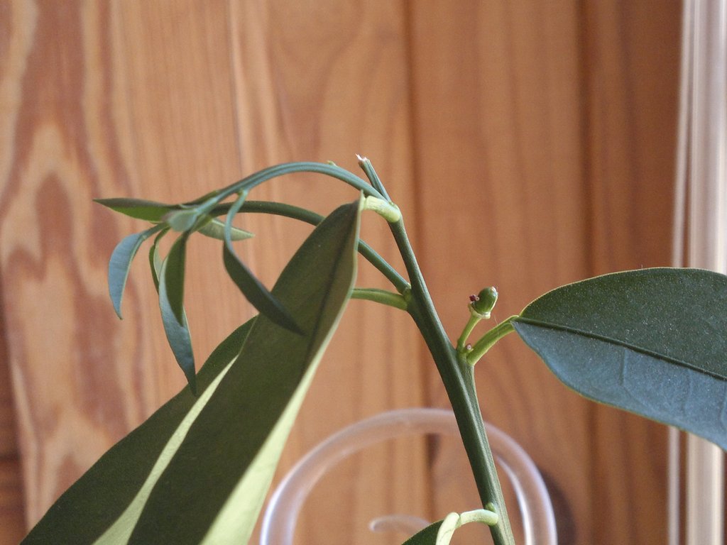 . Так вот, Мейва в таком же состоянии, что и месяц назад. Но отпало два листика (после усыхания) со средины ствола. Плодик завязался до залива, не растет (в отличии от плодов на других кумкватах). Подвой не прорастал. На всех остальных сортах, в т.ч. и с молодым приростом такой картины нет. Еще может быть, что горшок уже маловат.