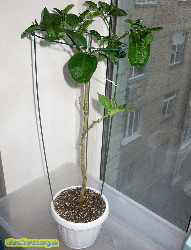 Иногда цитрусы растут не так, как хочется хозяину. В данном случае хозяином буду выступать я. :smu:sche_nie: Некоторые цитрусовые прививки растут, либо одним стволом, либо ещё выбрасывают один боковой побег, и не всегда, где хотелось бы. В таких случаях жду, пока ствол цитруса доберётся к отметки в сантиметров тридцать. Далее ставлю боковую опору, беру верх цитруса, и загибая к низу пристёгиваю к опоре подручными средствами. Делаю такую операцию, как правило в конце очередной волны роста, в начале набора тургора листьями. Таким образом надеюсь на, 1-е - утолщение ствола; 2-е - усиленное развитие боковых почек, особенно в месте вершины изгиба. Ну и наконец 3-е - собственно просыпание боковых побегов, таким образом как бы "закустить" крону. В данном случае на фото лайм, два лимона и лаймкват.