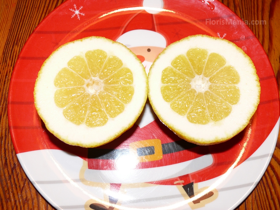 К Новому году сорвала. Сама мякоть кислая, но кожура ароматная и запах очень приятный.В чай, в качестве лимона, даже очень и очень.