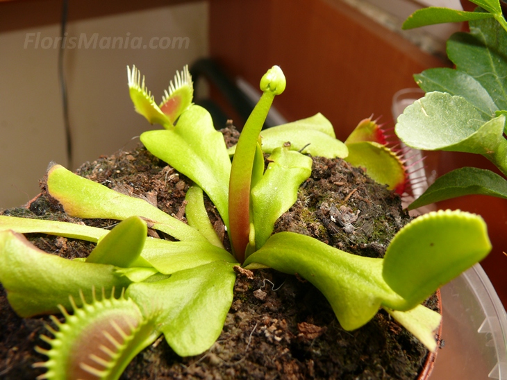 Мухоловка успешно перезимовала - без еды и практически без поливов. Сейчас надумала цвести. На ярком солнце ловушки приобретают ярко-красный цвет.