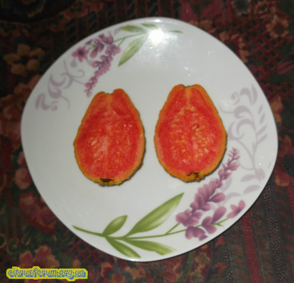 Аромат сильный, "тропический", даже не знаю с чем его сравнить, но пахнет приятно. Мякоть довольно плотная, красновато-оранжевая. Костей много, но они все собраны в середине и при желании, их можно выбрать ложкой или есть прямо с ними. Вкус приятный, немного терпкий, но сладости явно не хватает, видимо я её или рано сорвал или же просто не хватило тепла для нормального набора сахара (дерево стоит на холодной веранде, а там жуткий колотун, лимоны хорошо это переносят и даже цвести пытаются, а Гуаява, видать без тепла нормально зреть не хочет). В целом: вполне съедобный, экзотический фрукт получился.