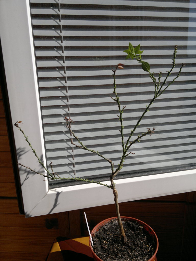 На рабочем подоконнике тоже есть потери. Полностью усох Каломандин. Теперь у меня нет ни пестролистых, ни обычного. Все, как говорится происходит в рамках кампании по замещению кислятины в коллекции :-) . Пришлось также разгрузить от плодов Мейер у котрого осталось 4 листика на 4 плодика. Поскольку на ветках начали просыпаться почки, решил пока, в порядке эксперимента оставить 1 плод. Зато теперь пью чай с "лаймом".
