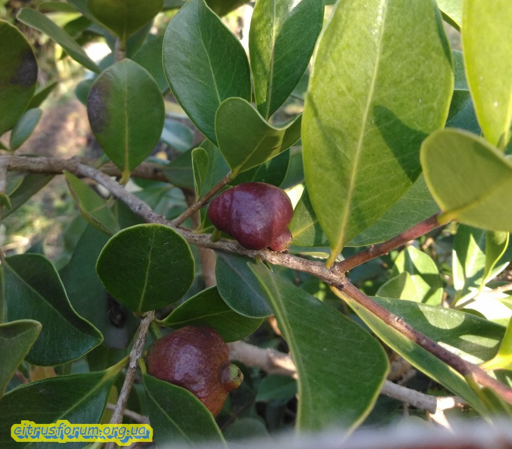 На земляничной гуаве, потихоньку начинают окрашиваться плоды.