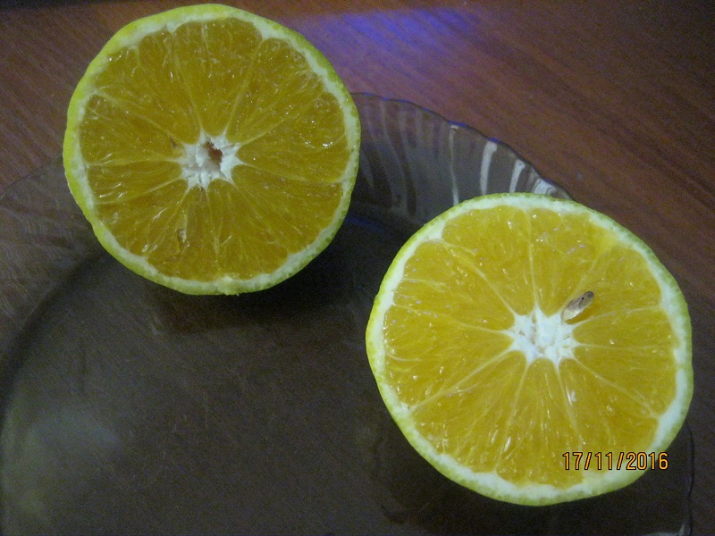 Ну вот и сорвал я свой первый апельсин! Правда сорт не знаю! Может Вы подскажите!?При разрезе пошёл очень сильный запах на мой взгляд как у обычного покупного апельсина! Семян было 3 штуки и то не доразвитые,кожура тонкая легко отделяется,а на цвет кажется что это какой то из пигментированных сортов!На вкус сладкий с лёгкой кислинкой и очень нежный не навязчивый как у покупных!После вкусье определяется еле уловимый привкус мускатного ореха!Апельсин очень вкусный!Хочу ещё!!!!