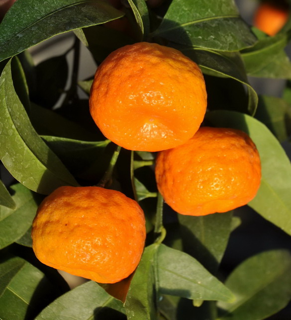 Плоды: плосковыпуклые, как у мандаринов, максимально 5x3 см, кожура от ярко-оранжевой до красноватой, косточек много, высокоурожайный сорт, плоды подолгу держатся на дереве, по этому показателю растение сравнимо с каламондином.