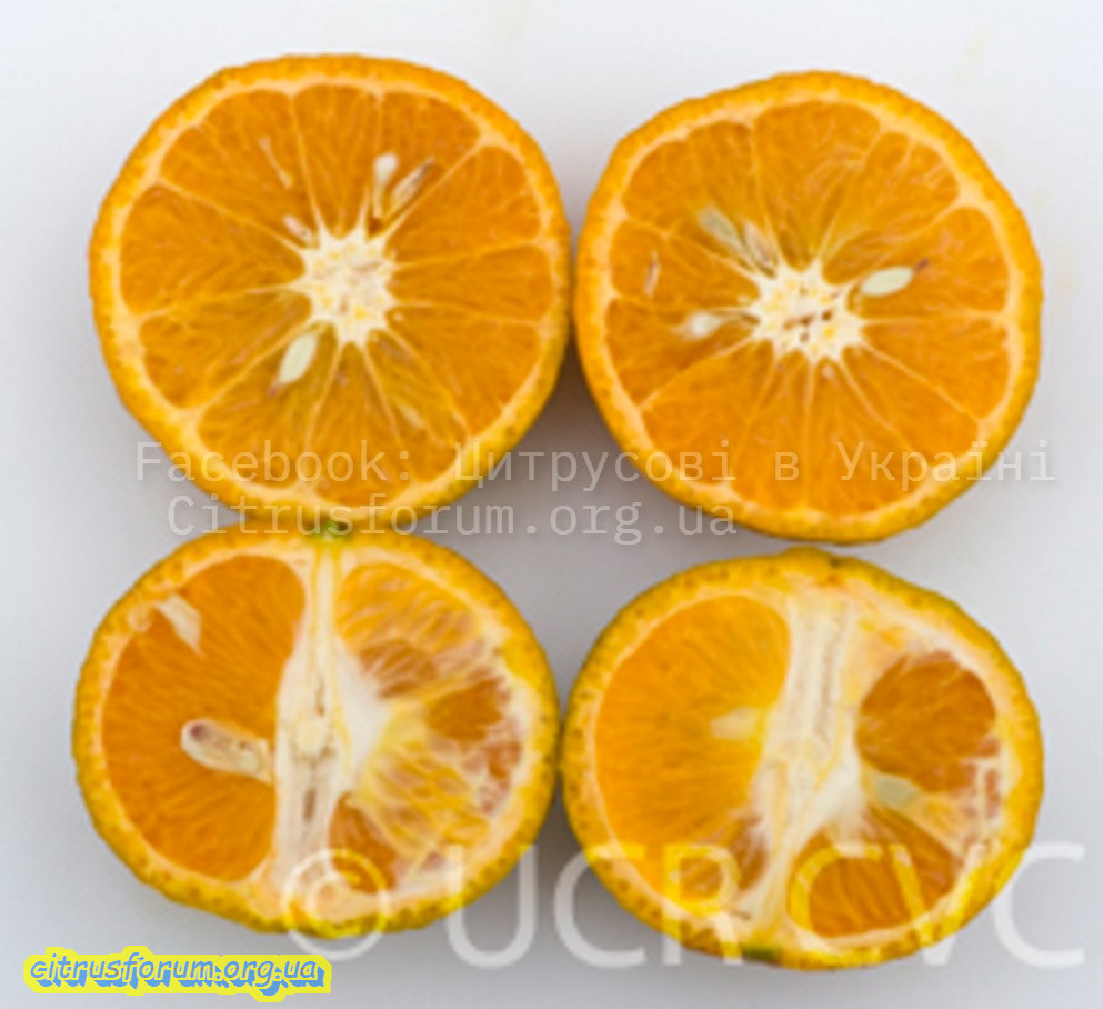 Сегменти 9-12, тверді, але легко відокремлюються. Колір м’якоті насичено-помаранчевий, дуже соковитий, насичений смак, яскраво-ароматний та виразний. Насіння помірно численні, однозародкові. Зберігає якість і добре зберігається на дереві.