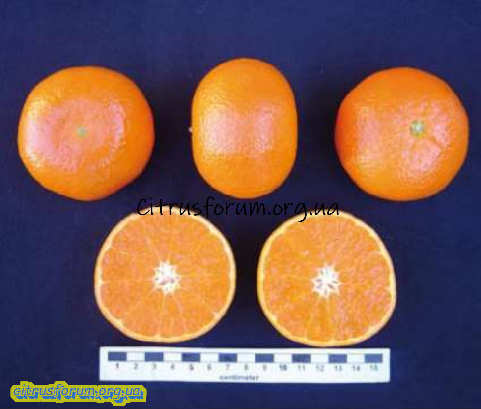 Рівномірний розмір плодів із середнім урожаєм. Плід твердий і помірно легко очищається, залишаючи невеликий альбедо. Зовнішній вигляд яскраво - оранжевий / червоний колір з гладкою до злегка грубою шкіркою яка стійка до дощу та плям. Внутрішній колір плодів темно - оранжевий, а деякі плоди мають внутрішній пупок. Високий цукор з хорошим рівнем кислотності. Плоди без кісточок при посадці в ізоляції. Brix 11 -14%. Кислота 0.8 -1.1%. Сік 54-62%. Вага сер. 210г.