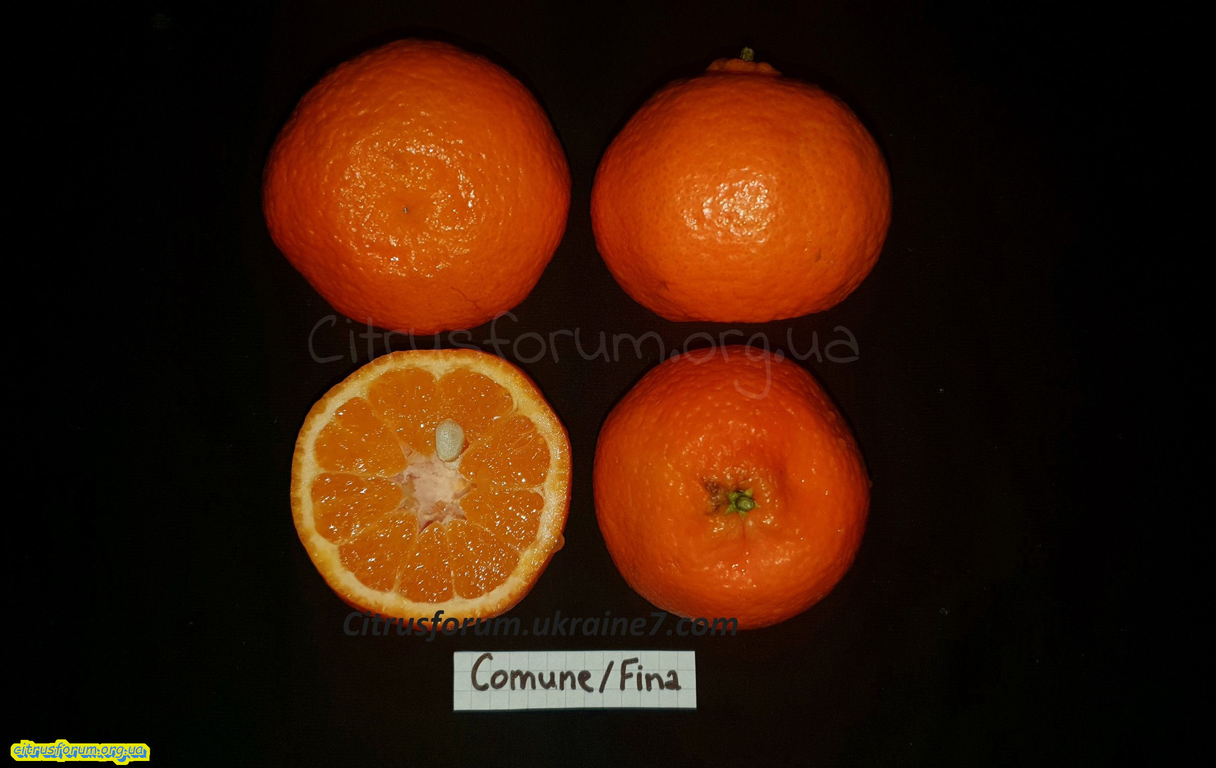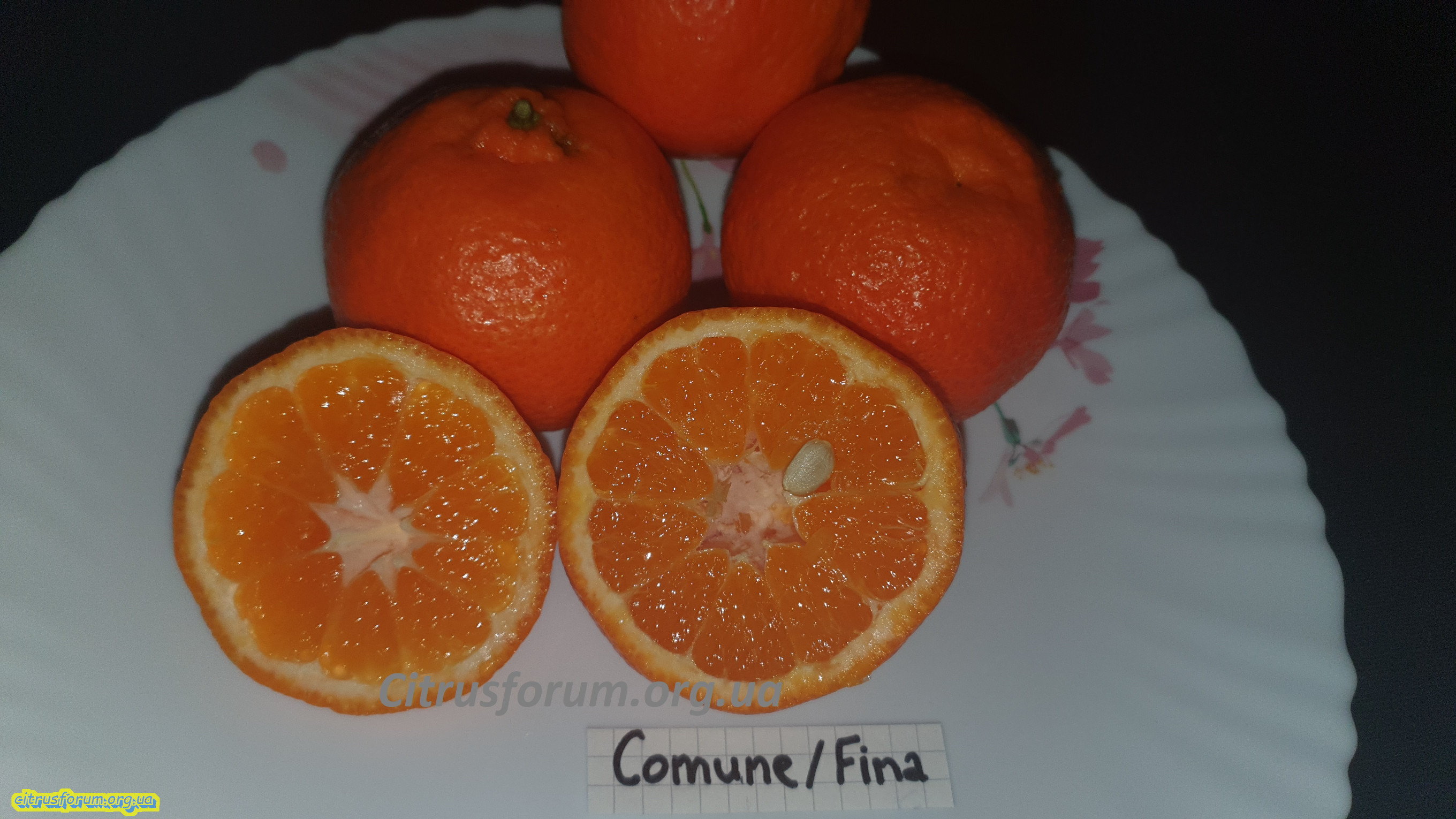 Commune / Fina - Шкірка оранжево-червона при повному дозріванні, і легко очищається. Смак солодкий і без кислинки, аромату не відчувається. Сегментні мембрани (стінки чи перегородки) також не відчувалися. Насіння 1-2шт на плід. Цукристість 11.2%.