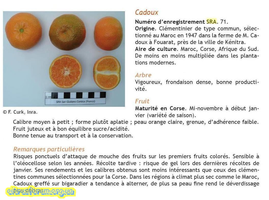 Вопрос по Cadoux довольно интересный, тем более, что Риверсайд использовал не свои данные. Есть данные тех же мароканцев, что данный клементин имеет имя хозяина хозяйства г-на Cadoux a Fouarat, мера города Кенитра. Данный клементин известен с 1947 года.