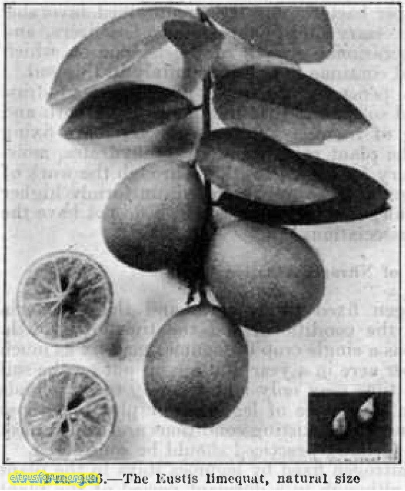 Гибрид, выбранный из них как наиболее многообещающий, оказался результатом опыления цветов West Indian lime пыльцой круглого кумквата (kumquat Marumi). Поскольку скрещивание было сделано в Eustis, Fla., плод был назван Eustis limequat. Он поразителен, безупречно красивого внешнего вида, напоминающий лайм по размеру и текстуре, но цветом светло-желтого грейпфрута. (Рис. 136.) У него тонкая, но твердая кожица, очень сочная и ароматная мякоть, кроме моментов, когда они очень спелые, мало семян, его едва ли может отличить увлечённый, или даже эксперт, от настоящего лайма. Его фрукт развивает свой объём сока еще пока зеленый, так что, как и лайм, его можно и должно использовать, пока он еще частично зеленый. Дерево вечнозеленое, сильно рослое, рост прямостоячий с небольшими заостренными листьями. Колючки на несущих ветках очень незаметны, это свидетельствует в пользу этого гибрида, в отличие от сильно колючего лайма.