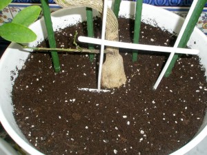 Прививка интересная и был накручен на небольшую решётку. Потом пришлось всё это перекручивать. Получилось не очень, т.к. ветки были уже одревесневшие.