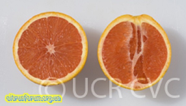 Строкатий Cara Cara. Різноманітний вид пупкового апельсина Cara Cara з більш насиченою рожевою м’якоттю, але менш соковитою, невеликою кількістю насіння і хорошим смаком, низька врожайність через строкатість.