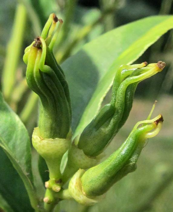 Ветки-альбиносы, а точнее листья через месяц - полтора стали понемногу засыхать. Поначалу обрезал листья по сухому, но поскольку эта картина присутствовала на всех таких ветках, то к весне почти все обрезал. С месяц назад начался новый прирост и я уже выламывал альбиносы в самом начале их появления. Но вот, что интересно. Похоже из веток-альбиносов таки можно дождаться пестрый прирост. На одной из такой обезлиствененной ветке выламывал 3 наметки на альбиносный прирост. И четвертая почка выдала зачатки (пару милиметров) пестрой листвы. Но к этому времени волна роста остановилась и этот зачаточный прирост замер. Что, кстати, также подметил - такой зачаточный прирост этот сорт не сбрасывает и с началом новой волны роста он продолжает развиваться. 2 завязи первого моего прироста отпали почти сразу. Во второе цветение завязалось три плодика, хотя бутонов было штук с 20. Завязи на пестрой РБ чуть более меньше (хрупче) по сравнению с обычной РБ.