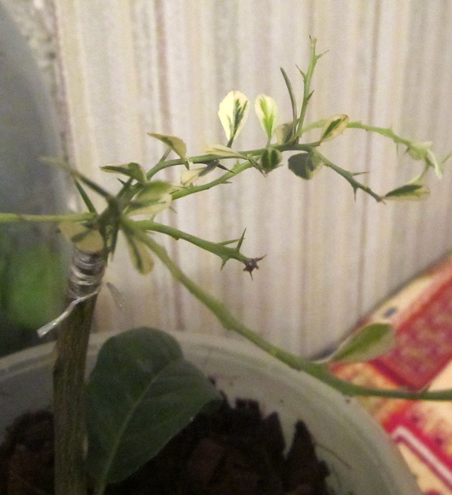Рискну открыть тему в честь этого красавца. Приехал перед Новым Годом, такой себе подарочек сделала. Очень уж мелкий, но видно, что варьегатный, ошибиться трудно. Пока не загнулся, дышать на него боюсь. Плоды обещали очень красивые. Сорри за не очень качественное фото, но уж что есть