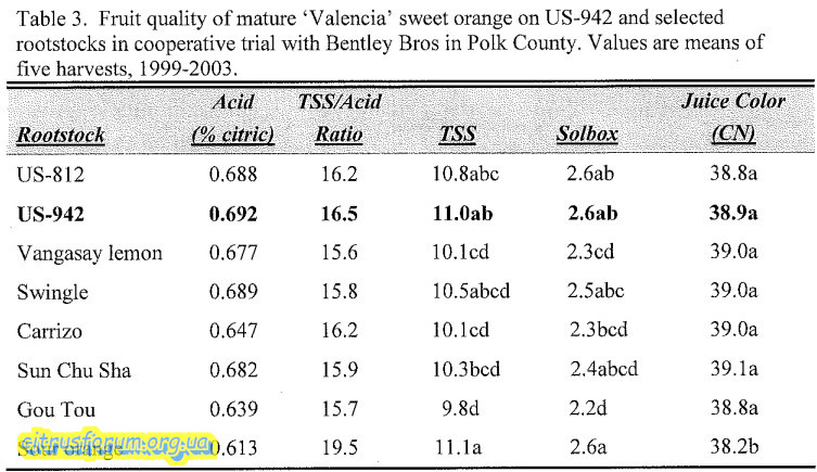 Продуктивність була видатною під час випробувань як на добре дренованих глибоких ґрунтах, так і на важких ґрунтах із високим рівнем грунтових вод. Зовсім недавно US-942 був найкращим у польових випробуваннях, уражених хворобою зеленіння цитрусових Huanglongbing, а характер його толерантності до Huanglongbing був предметом детальних тепличних досліджень. Основні несправності поки що не виявлені. Хоча відносно невідомий в інших областях виробництва цитрусових, US-942, ймовірно, буде найбільш використовуваною підщепою для нових розмножень у Флориді протягом 2018-19 років, випереджаючи раніше найбільш використовувані підщепи Kuharske, Swingle, sour orange і X639. Характеристики та польові характеристики US-942 були описані в додаткових публікаціях (Albrecht and Bowman, 2019; Bowman and Albrecht, 2017; Bowman et al., 2003; Castle et al., 2004, 2011; McCollum and Bowman, 2017; Wutscher і Боумен, 1999).
