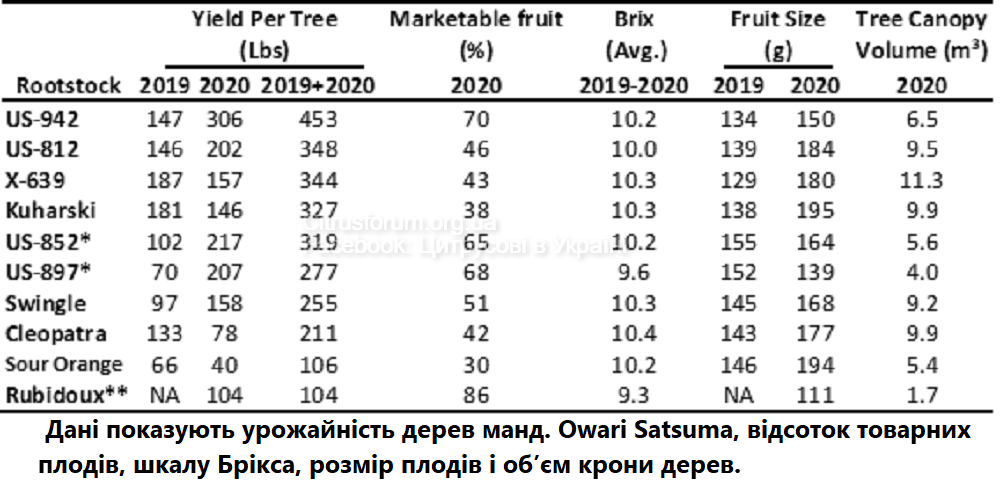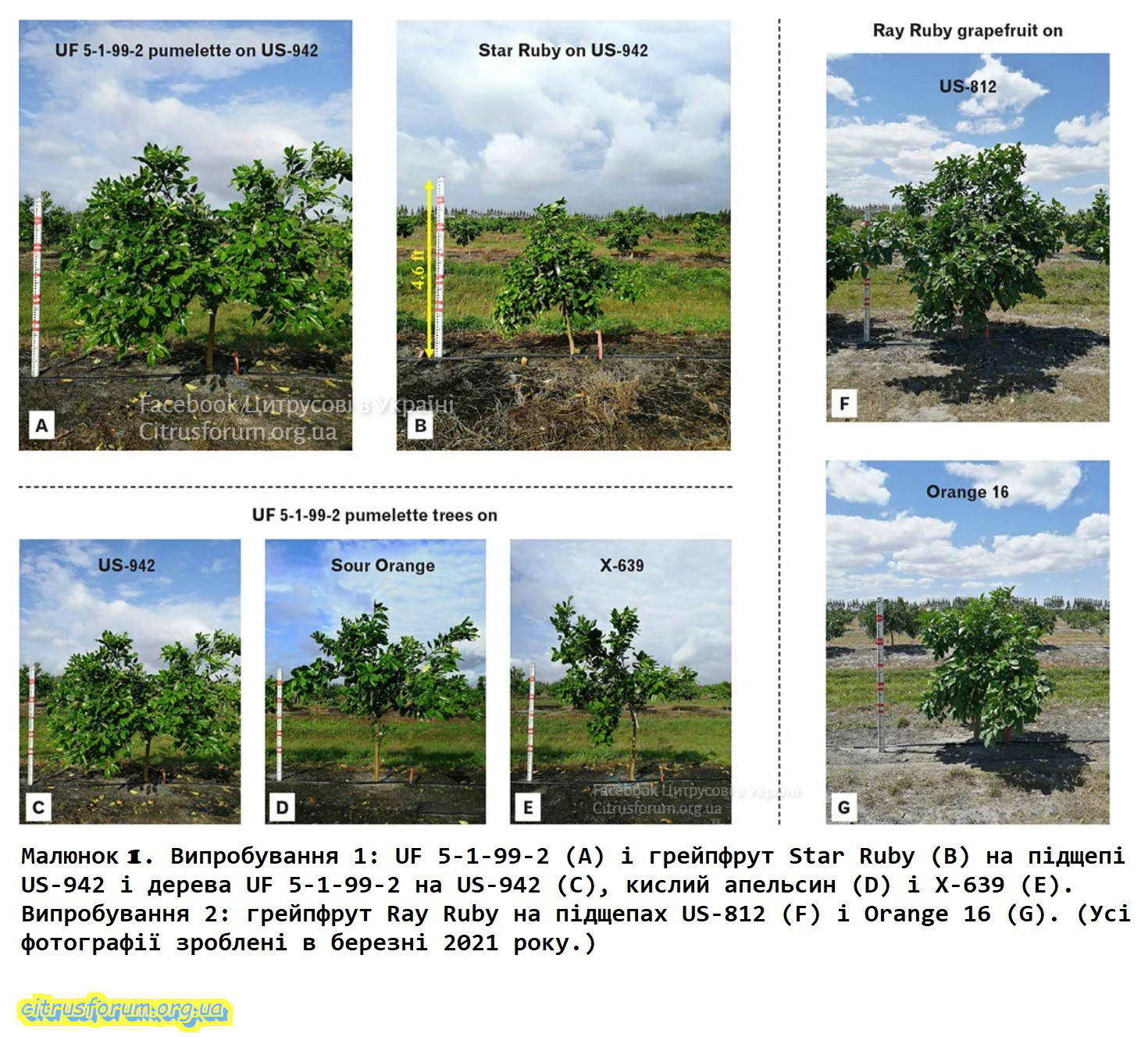 У випробуванні 1 (грейпфрут) UF 5-1-99-2 pummelette розвинув об’єм крони приблизно в п’ять разів більший, ніж дерева Star Ruby, які були меншими та компактнішими (мал. 1). У рамках тієї ж оцінки підщепа US-942 значно збільшила об’єм крони та діаметр стовбура, ніж кислий апельсин і X-639 (мал. 1).